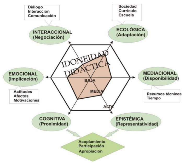 Grado en que un proceso de instrucción reúne ciertas características que permiten calificarlo como adecuado para la adaptación entre los significados personales obtenidos por los alumnos (aprendizaje) y los significados institucionales, ya sean pretendidos o implementados (enseñanza), considerando la influencia del entorno (Godino, 2013).